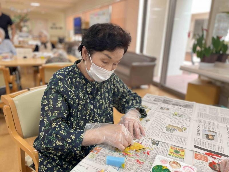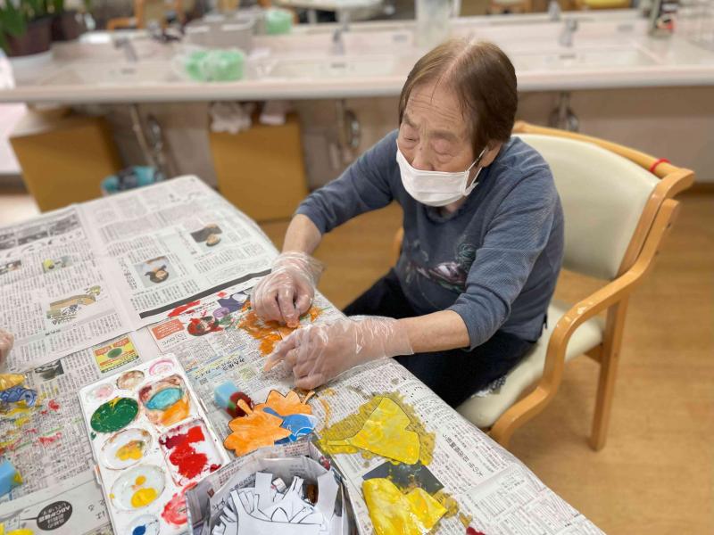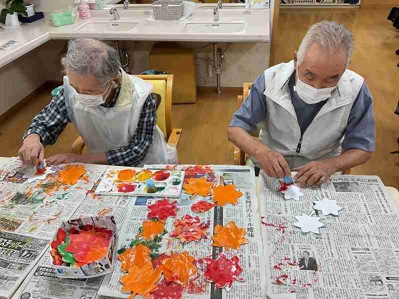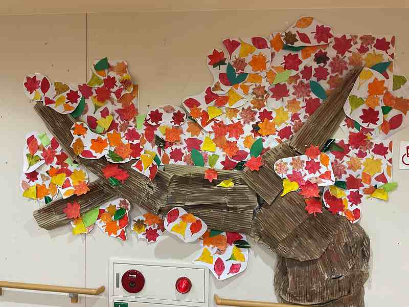 秋が訪れました。 南東北デイサービスセンター八山田:2025.10.09 デイサービスフロアにある大きな木が、季節の移り変わりと共に色とりどりの紅葉に様変わりました。 利用者さんが一枚一枚丁寧に作成しました。 #南東北#八山田#デイサービス#創作活動#紅葉 丁寧に色付けします。 何色がいいかな。 たくさんのモミジを作ります。 フロアも秋らしくなりました。 前のページに戻る