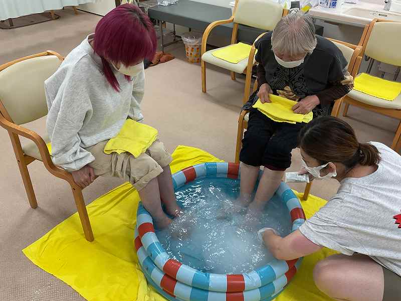 秋の行事で芋煮会と足湯を行いました。旬の食材を利用した芋煮は好評で、おかわりをする利用者さんもいました。足湯では香りつきの入浴剤を使用し、リフレッシュしていただきました。